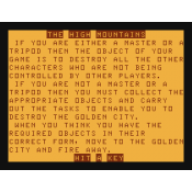 Loosely based on John Christopher's Tripods trilogy, this game allows up to four players to take the roles of the human resistance or the alien masters and their tripods. There are relatively few puzzles in this game, but a fairly large area to move around in and plenty of NPCs, many of which will be looking for a fight. Originally published as a type-in game for the ZX Spectrum in the British magazine Personal Computer News #79.
